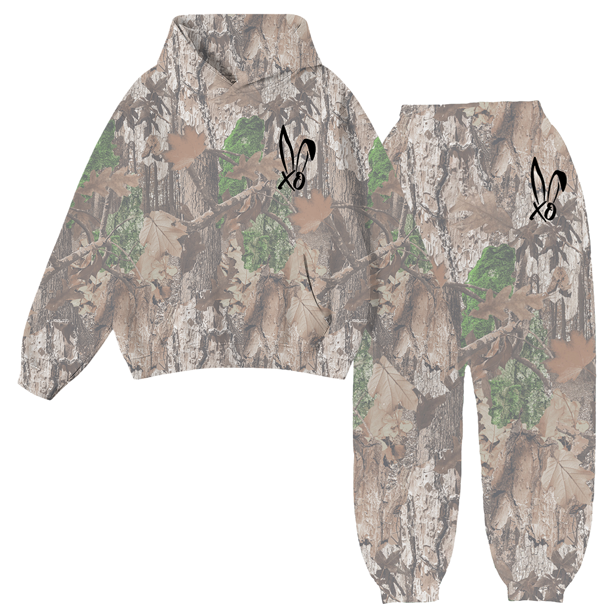 A real camo print sweatsuit set with Bunnie Xo's logo embroidered in black. A unisex fit style made in a soft cotton/polyester blend.