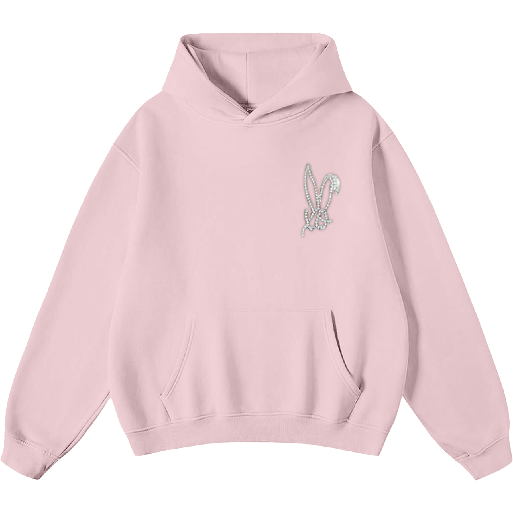A light pink hoodie with Bunnie Xo's logo in sparkly rhinestones on the front. A unisex fit style made in a soft cotton/polyester blend.